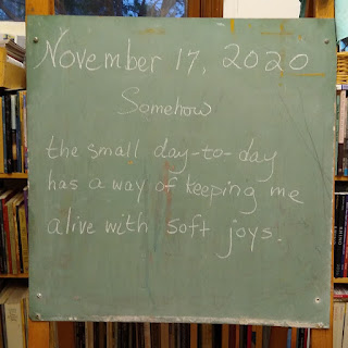 Mid-morning at work, I saw the email showing a picture of (individually-wrapped) goodies and little Starbuck's iced coffee bottles! So I had some! Then home to a Honeycrisp apple, and the Governor, live, telling us we are back in Tier 3, to please stay home, starting Friday, to keep us all alive. I am glad that my little chalkboard poems are "soft joys" for those who see them here, or on Facebook or Instagram. I'm grateful they are hitting the spot.Likewise, I was delighted with the response to my story, "A Retiring Woman," and grateful to Calyx for publishing it online. My daughter and her boyfriend were gripped by it, and she quoted a passage on integrity of voice. My son said he laughed out loud! Yay! It's a long story, and so many people read it and responded. I am wowed.